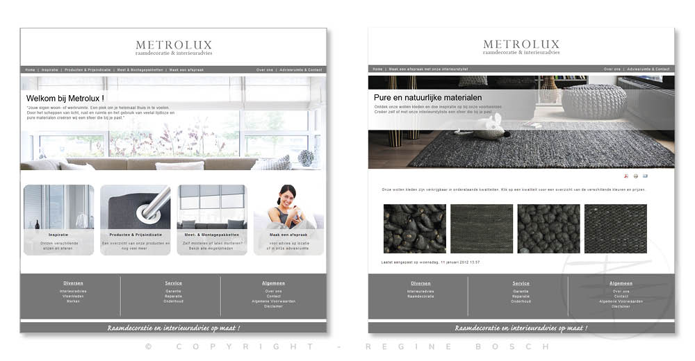 Voor Metrolux heb ik veel reclamemateriaal gemaakt, van website (raamdecoratie-op-maat.nl) tot brochure en diverse huisstijlcomponenten zoals briefpapier, visitekaartjes en meer. Haar huisstijl bestond al, in nauw overleg hebben we deze samen uitgewerkt.