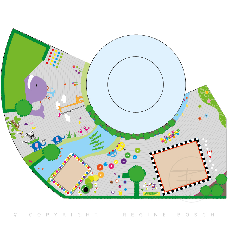 Voor een school in Arnhem was een nieuw kleuter speelplein nodig. Ik heb hiervoor een plan gemaakt van illustraties en beplanting. Verschillende spelletjes voor buiten heb ik hierbij opgenomen. een Klimrek en twee zandbakken waren al aanwezig. De wens was om meer natuur en groen te verwerken in het plan, maar het moest ook praktisch blijven.