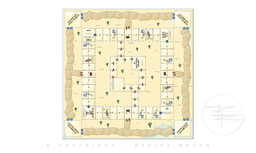 Concept, ontwerp, illustratie van bordspel. Ongeveer 20 jaar geleden gemaakt. Bedoeling was een anti-helden spel die juist hun geld moesten kwijtraken in plaats van winnen….