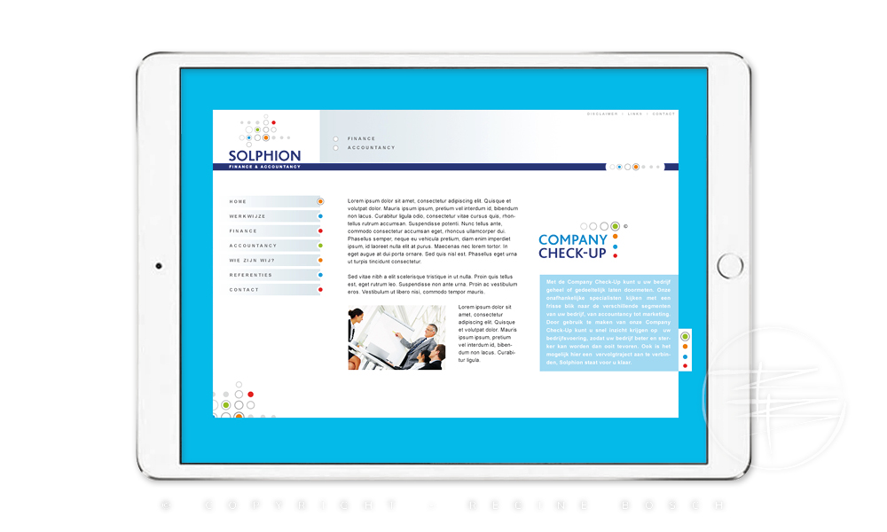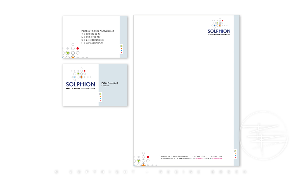 On request I designed a house style for Solphion, a financial consultancy firm. The house style had to be implemented in letterhead, business card and website. I opted for neutral and reliable colours, in combination with a number of secondary colours.